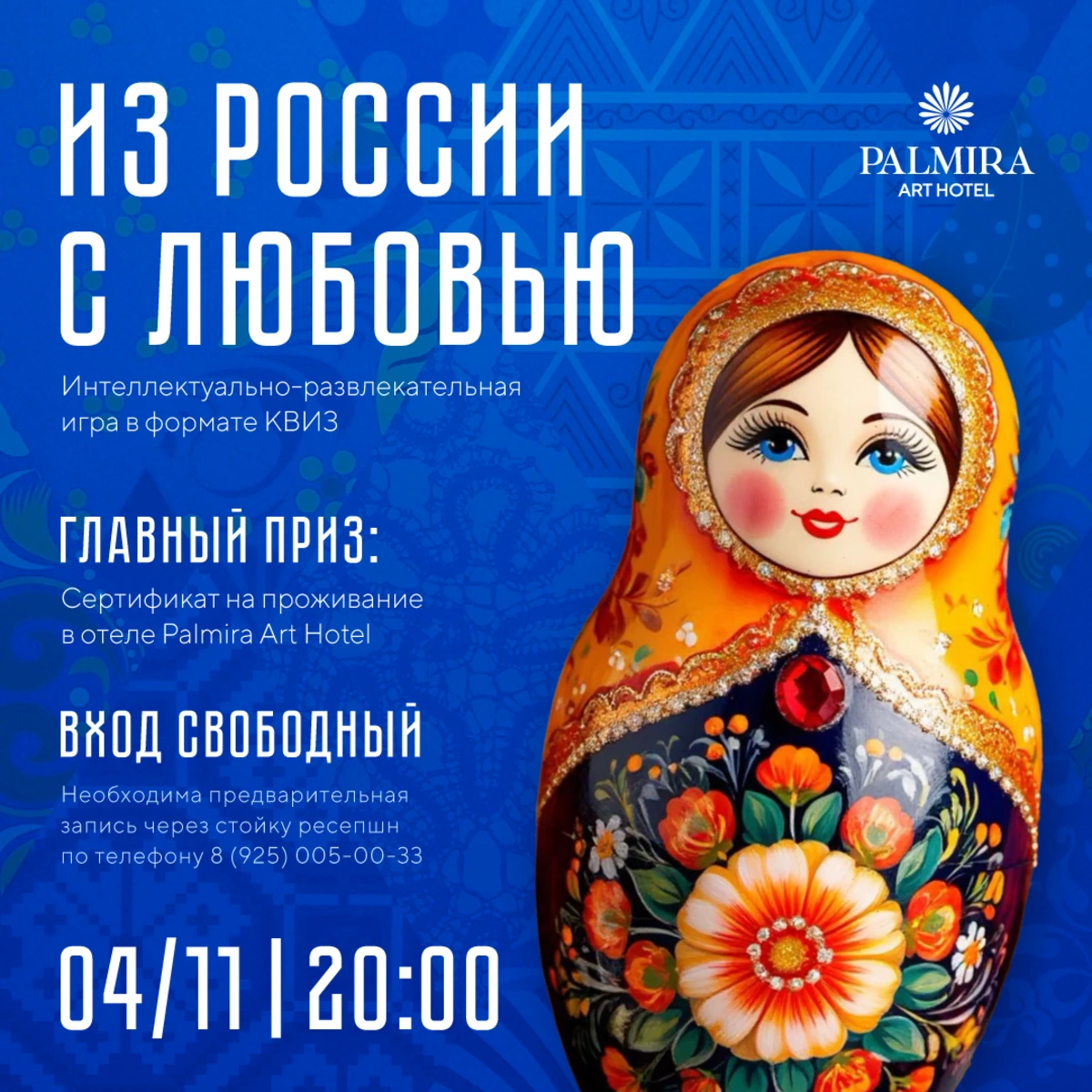 Откройте для себя новые грани безупречного отдыха в Москве, став гостем самого стильного и вдохновляющего арт-отеля столицы. Ждем Вас в Palmira Art Hotel!