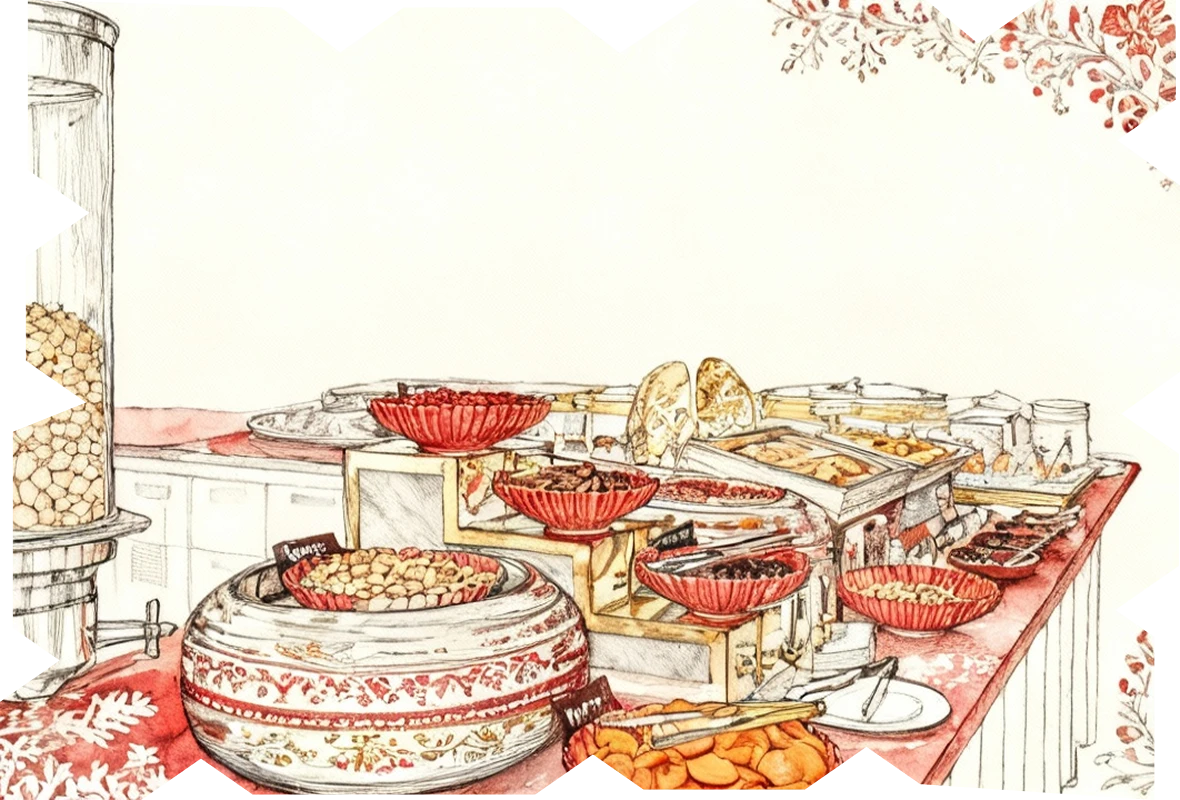 На столах ждут угощения — от сытных яств до сладких чудес. Откройте для себя гастрономическую сказку.