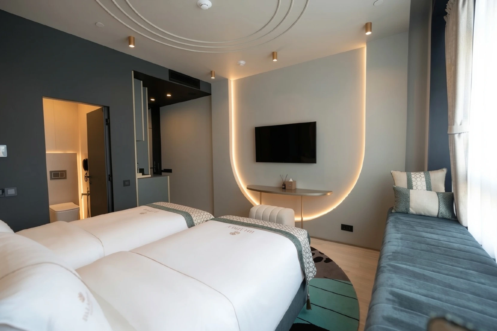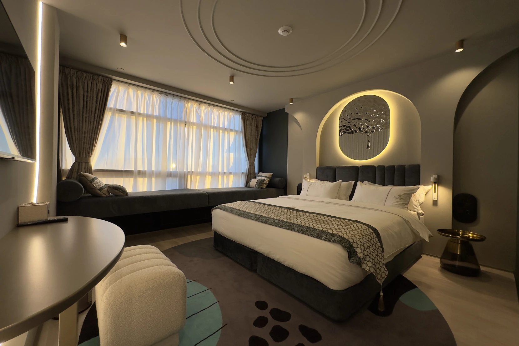 Просторный номер с панорамным видом на город, зоной отдыха с креслами и журнальным столиком. Его визитная карточка – эркер, наполняющий пространство светом и воздухом в солнечные дни. Отличное пространство для двоих, чтобы расслабиться и насладиться спокойной атмосферой.